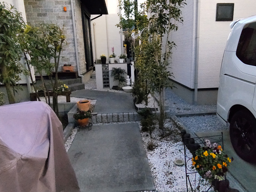平板の両サイドにはイエローの化粧砂利を敷くことで既存の外観に自然に溶け込む仕上がりとなり、段差も解消されたことで、奥様にも娘様にも安心していただくことができました。